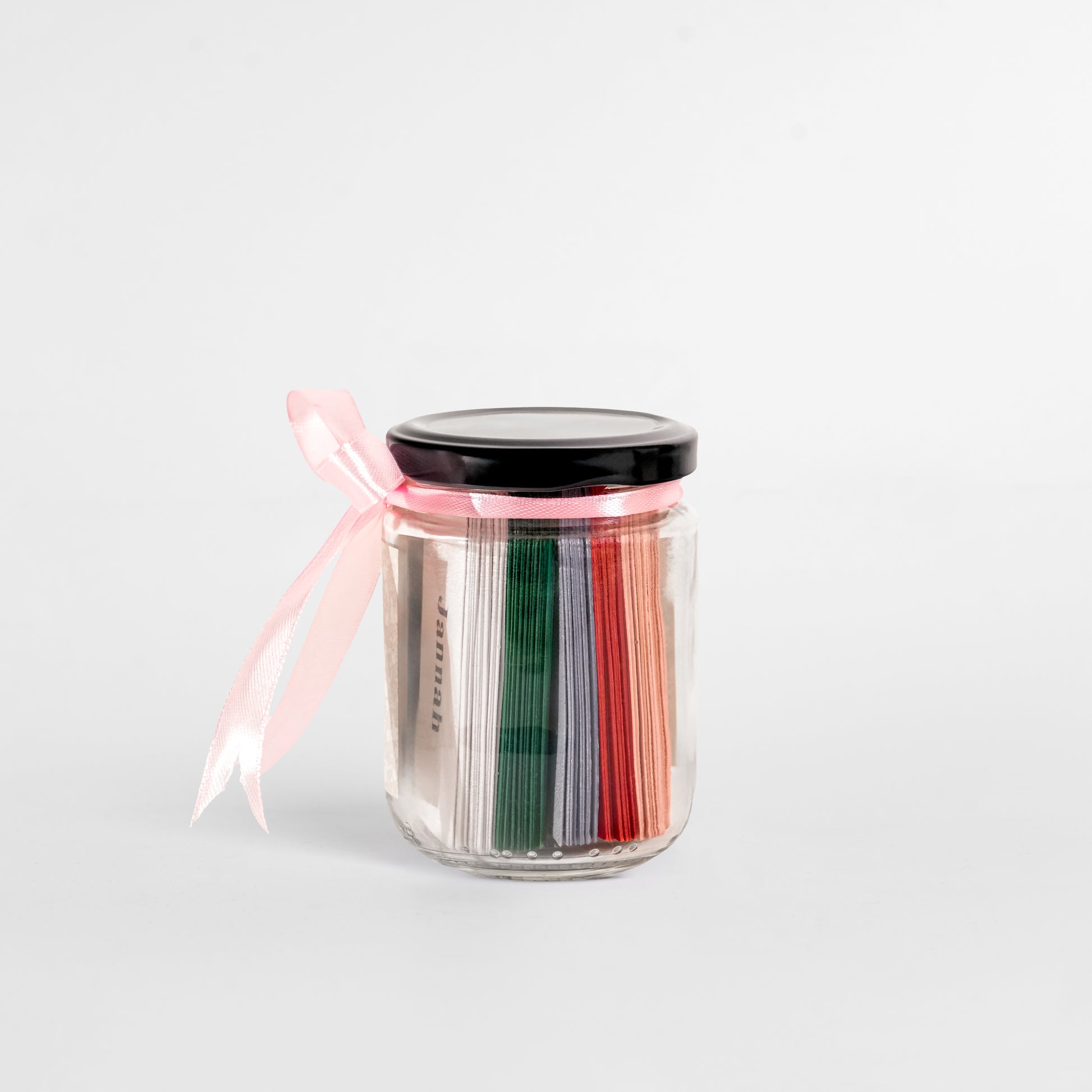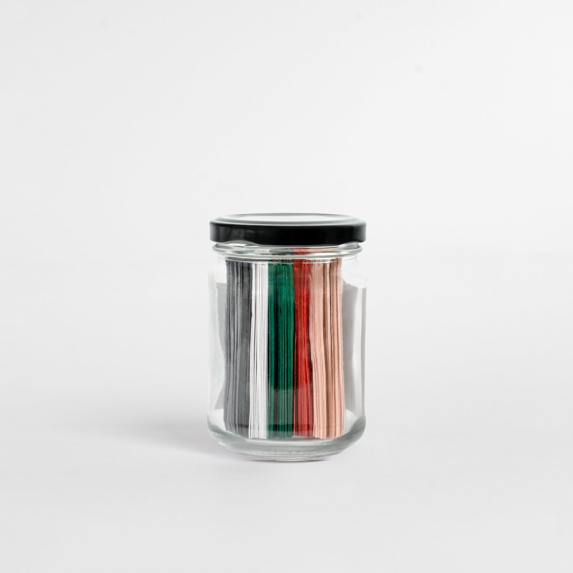 - Transparent glass jar with gold-foiled label.