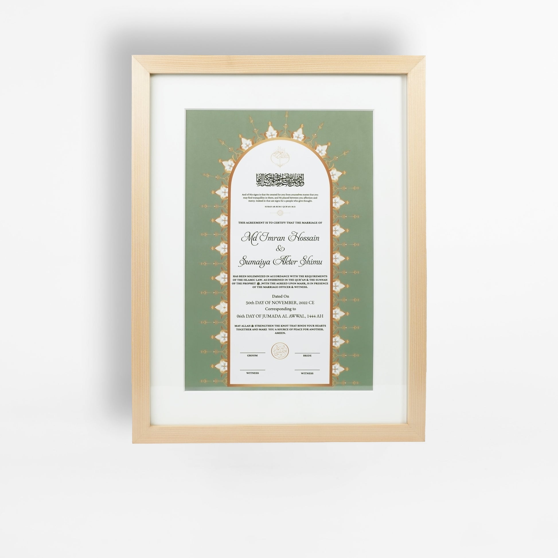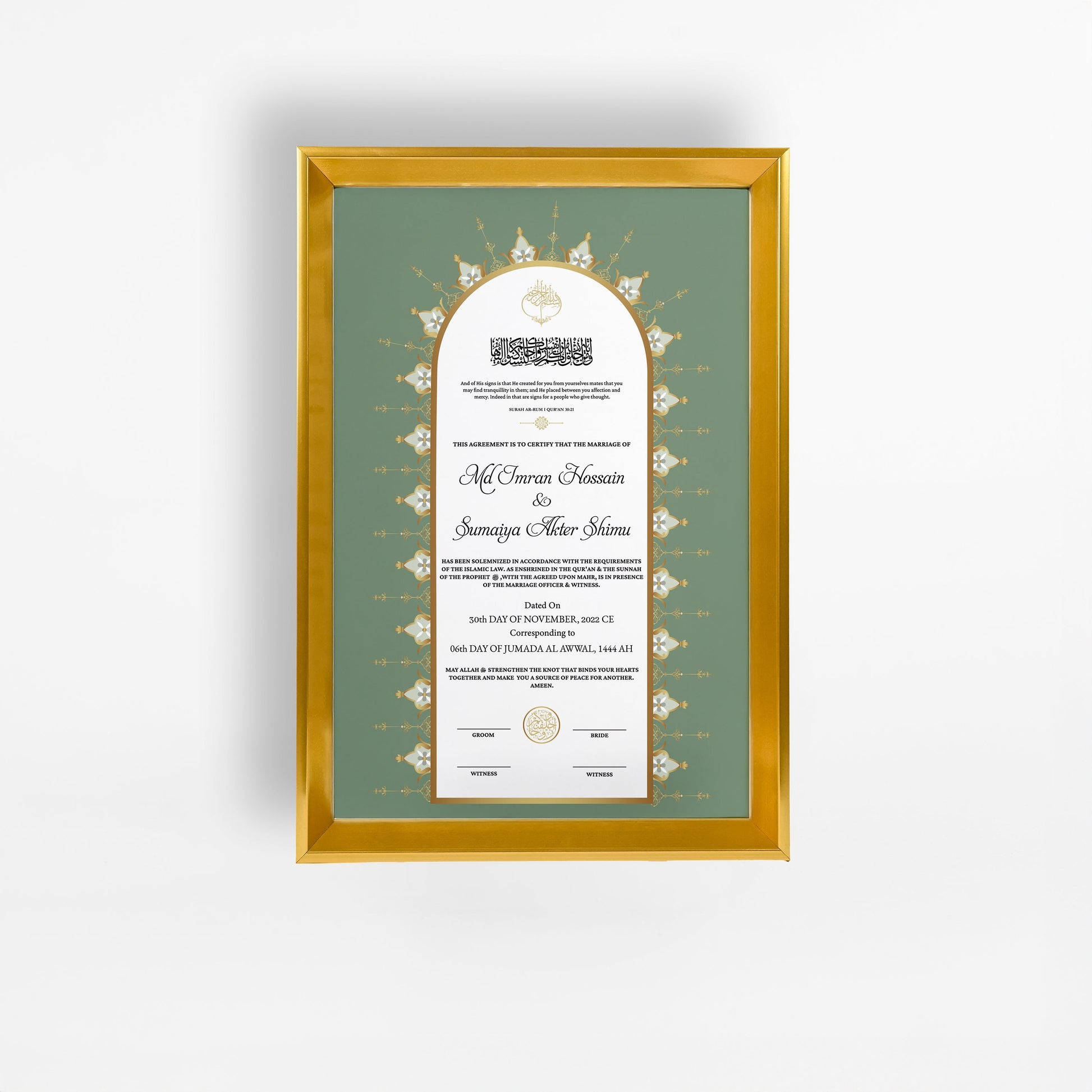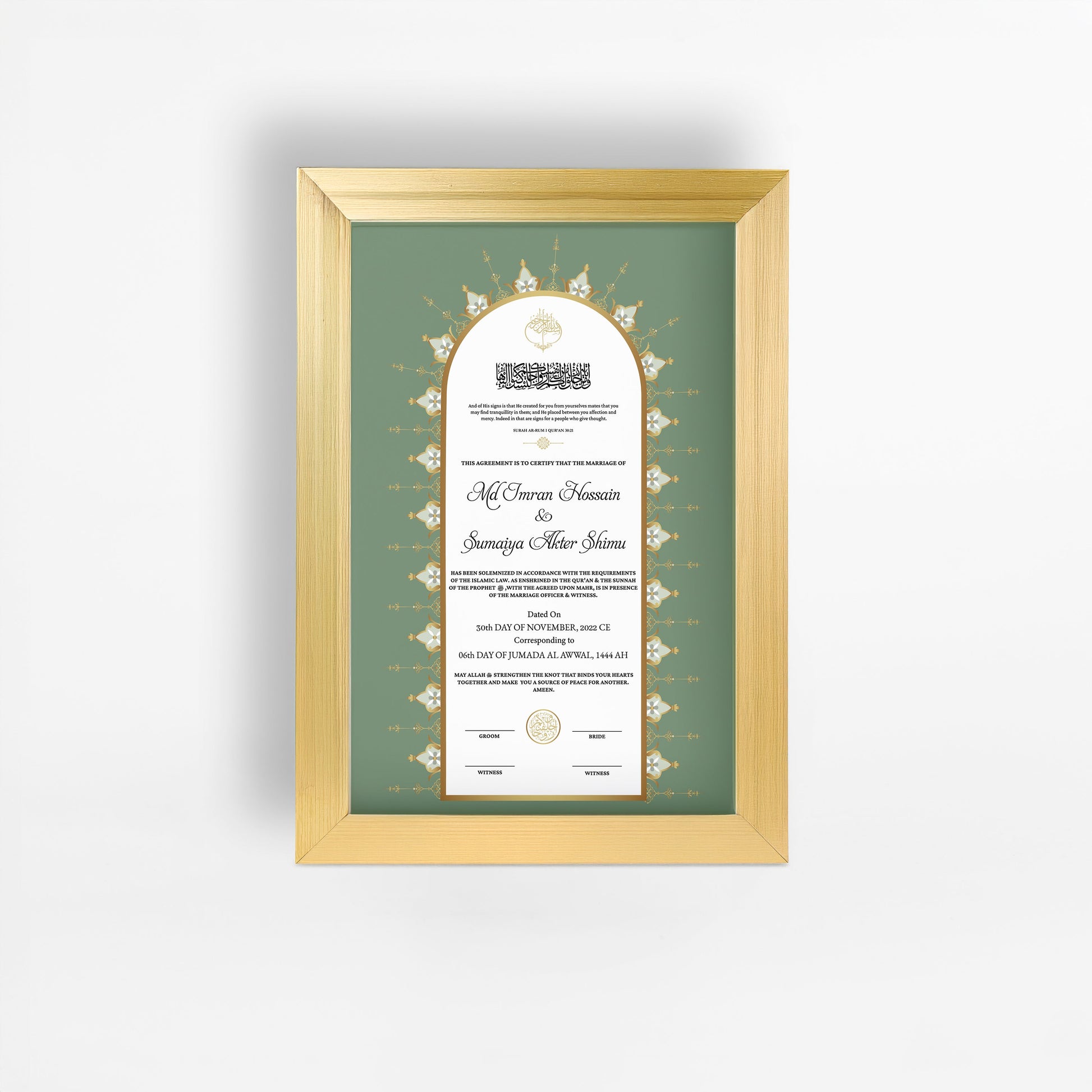 - Fully customizable Nikah Nama with bride and groom’s names.