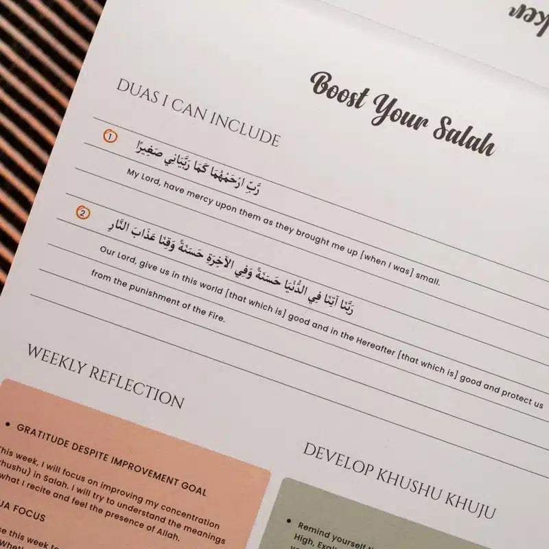 Stay organized and on top of your goals with our Salah Tracker. Featuring a sleek design and ample space for each day, it’s your perfect companion for efficient planning and productivity.