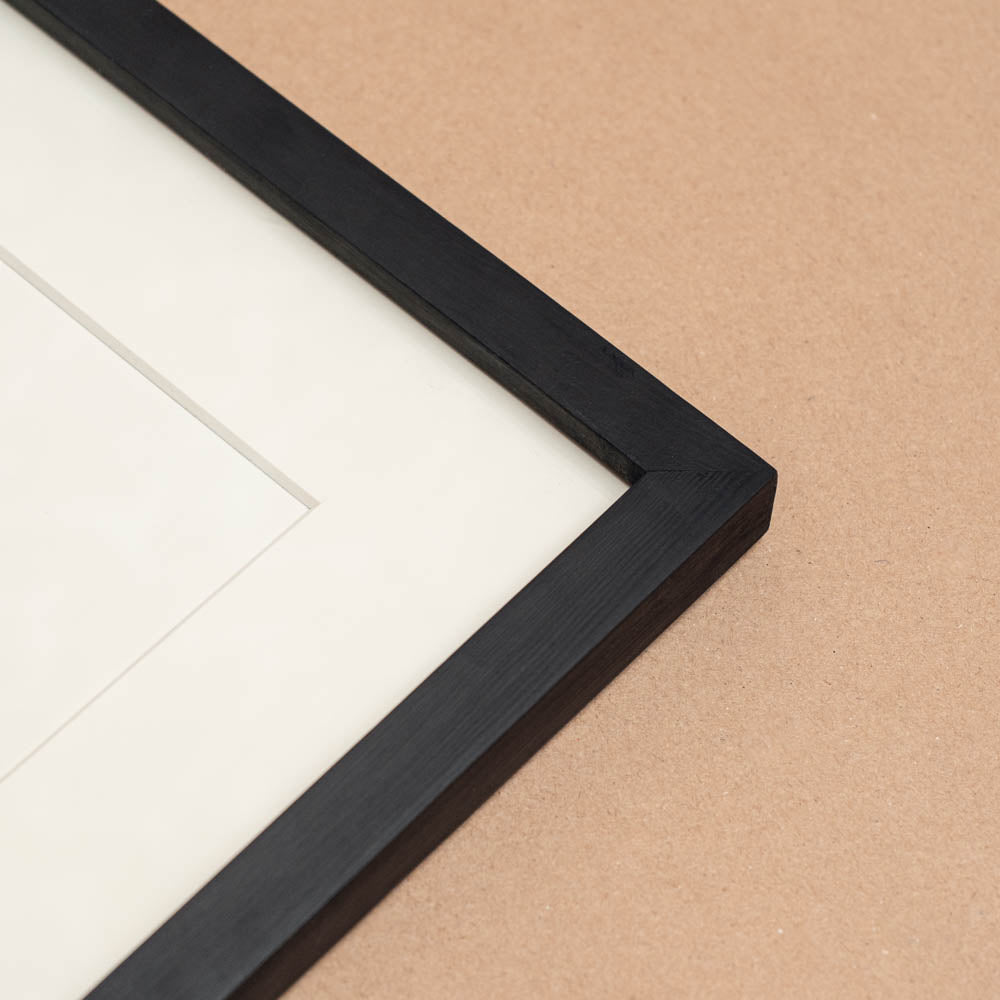 • Elegantly framed in a black wooden vertical structure with white mount and background — bold and refined.